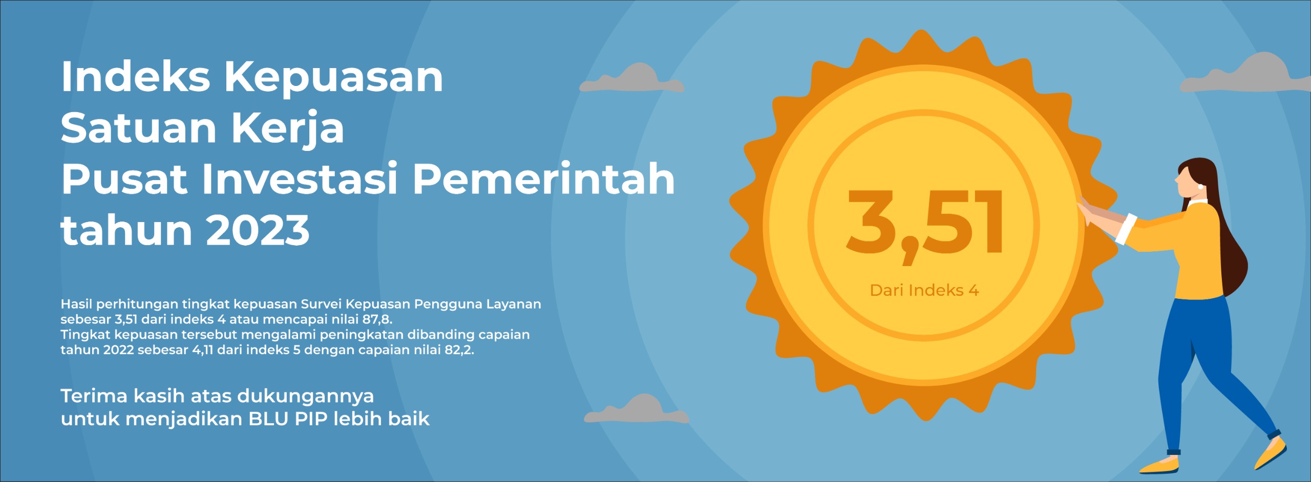 Hasil perhitungan tingkat kepuasan Survei Kepuasan Pengguna Layanan sebesar 4,11 (Memuaskan) dari skala 5,00. Kami mengucapkan terima kasih yang sebesar-besarnya kepada seluruh pengguna layanan atas hasil penilaian dan partisipasi aktif dalam pelaksanaan survei Kepuasan Pengguna Layanan tahun 2022.